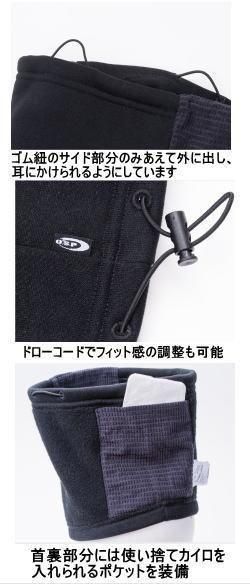 また、耳、口元まですっぽり覆うことができ、冬場の防寒アイテムとして◎。ドローコードを絞るだけの調整の場合、頬の締め付けがきつくなることがあります。O.S.Pネックウォーマーは、ゴム紐のサイド部分のみあえて外に出し、耳にかけられるようにしています。適度なサイズに調整したうえで、耳にかけて着用することで、締め付け感がなく、ずれ下がりも軽減し着用することが可能となりました。